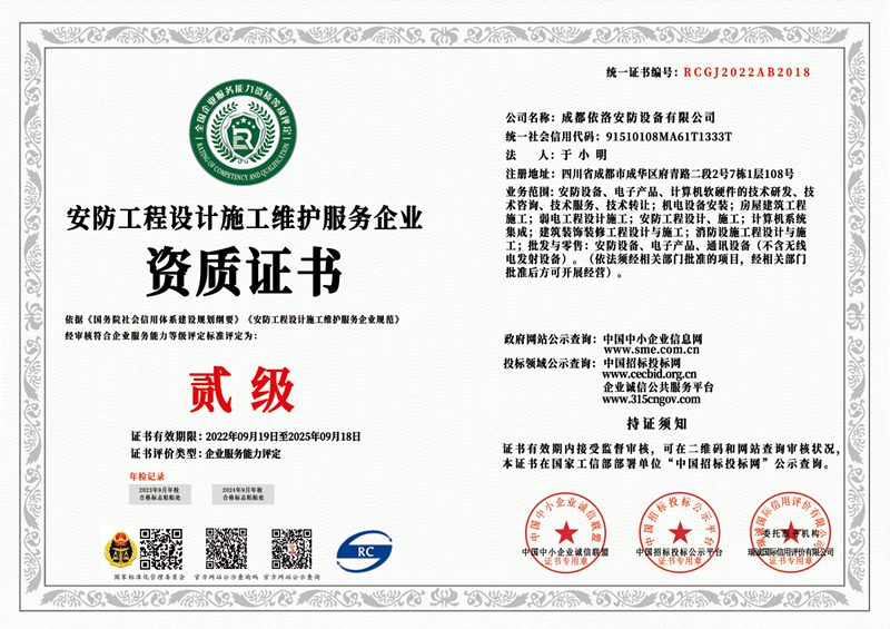 成都監(jiān)控安裝公司 之 安防工程(chéng)設計施工維護資質證書(貳級)